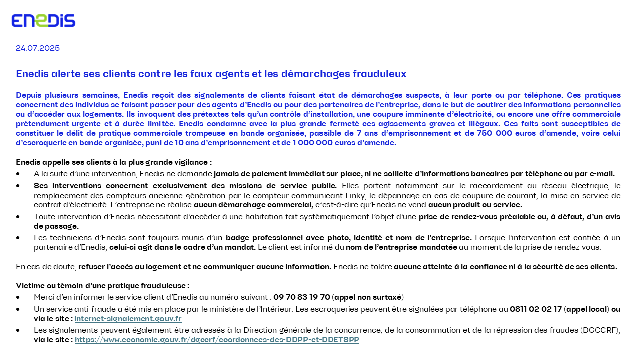 Depuis plusieurs semaines, Enedis reçoit des signalements de clients faisant état de démarchages suspects, à leur porte ou par téléphone. Ces pratiques concernent des individus se faisant passer pour des agents d’Enedis ou pour des partenaires de l’entreprise, dans le but de soutirer des informations personnelles ou d’accéder aux logements. Ils invoquent des prétextes tels qu’un contrôle d’installation, une coupure imminente d’électricité, ou encore une offre commerciale prétendument urgente et à durée limitée. Enedis condamne avec la plus grande fermeté ces agissements graves et illégaux. Ces faits sont susceptibles de constituer le délit de pratique commerciale trompeuse en bande organisée, passible de 7 ans d’emprisonnement et de 750 000 euros d’amende, voire celui d’escroquerie en bande organisée, puni de 10 ans d’emprisonnement et de 1 000 000 euros d’amende.